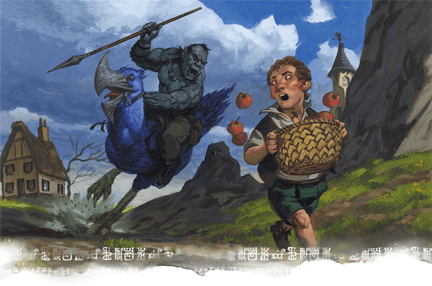 Teeon made it past the last pair of buildings that marked the edge of town when all of a sudden the air was filled with a shrill screech. Wide-eyed, he paused and looked over his shoulder. From around the corner of a nearby building came a blue-feathered axe-beak, a predatory bird the size of a horse often used as mounts by farmers, mercenaries, and raiders. Riding atop the beast and wielding a metal-tipped javelin was the blue-gray skinned orc.